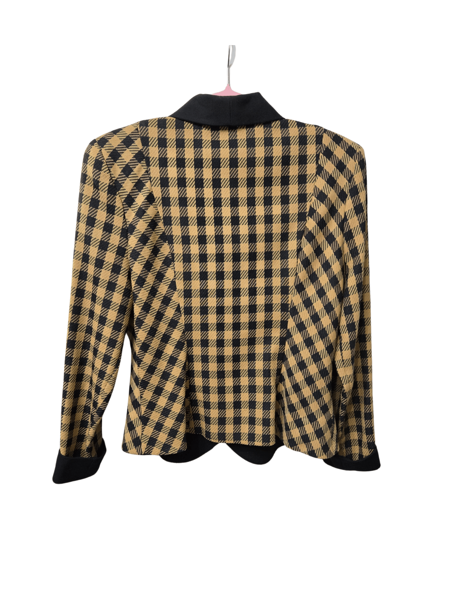 -Black & brown plaid print; double breasted; 2 tan/blk buttons & 1 hiddle snap button to secure; removable velcro shoulder pads