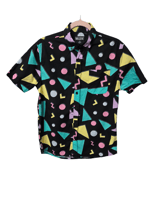 - Black with Pink/Yellow/Purple/Teal shapes print; 7 buttons; 1 front pocket