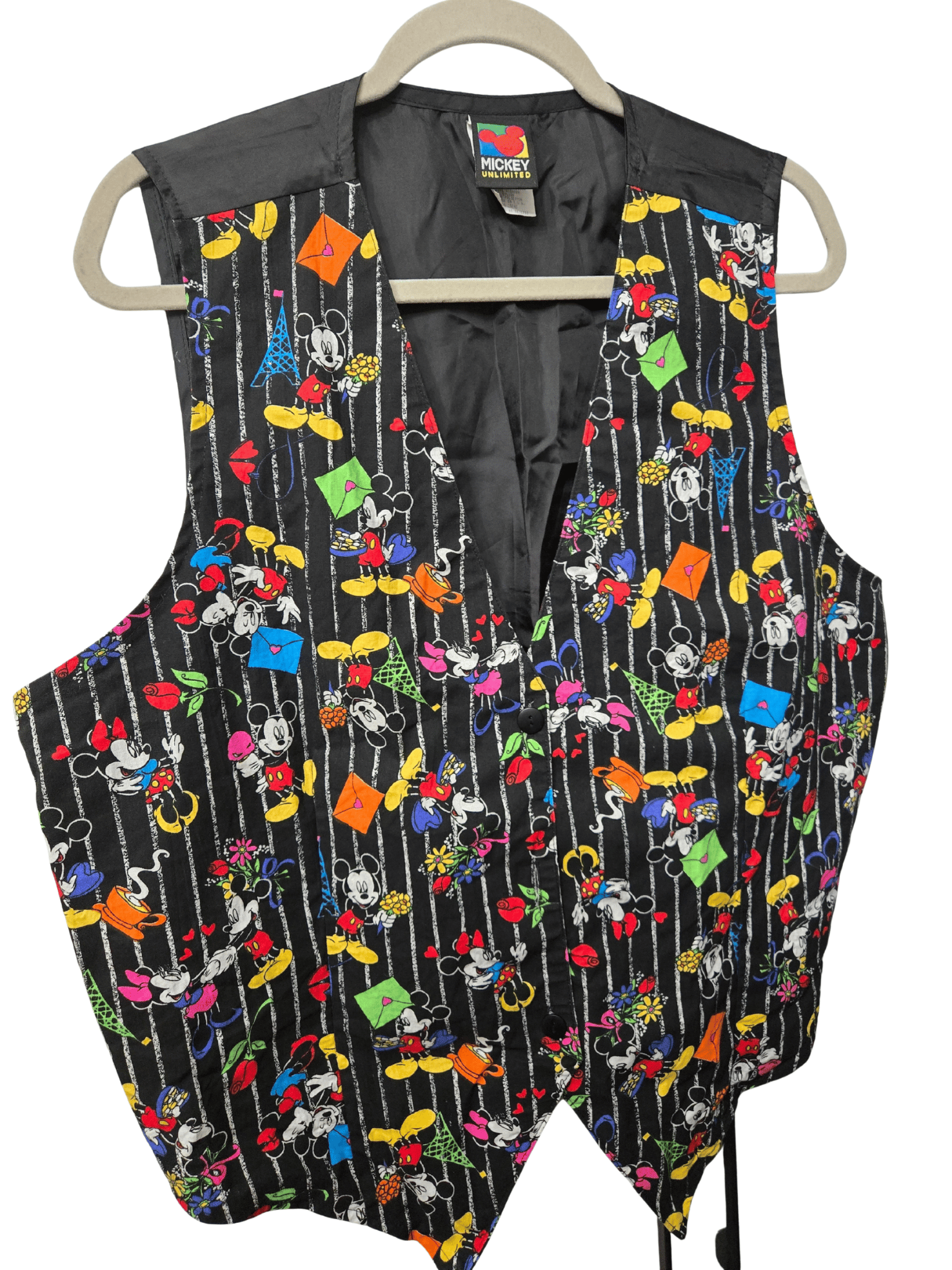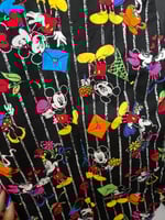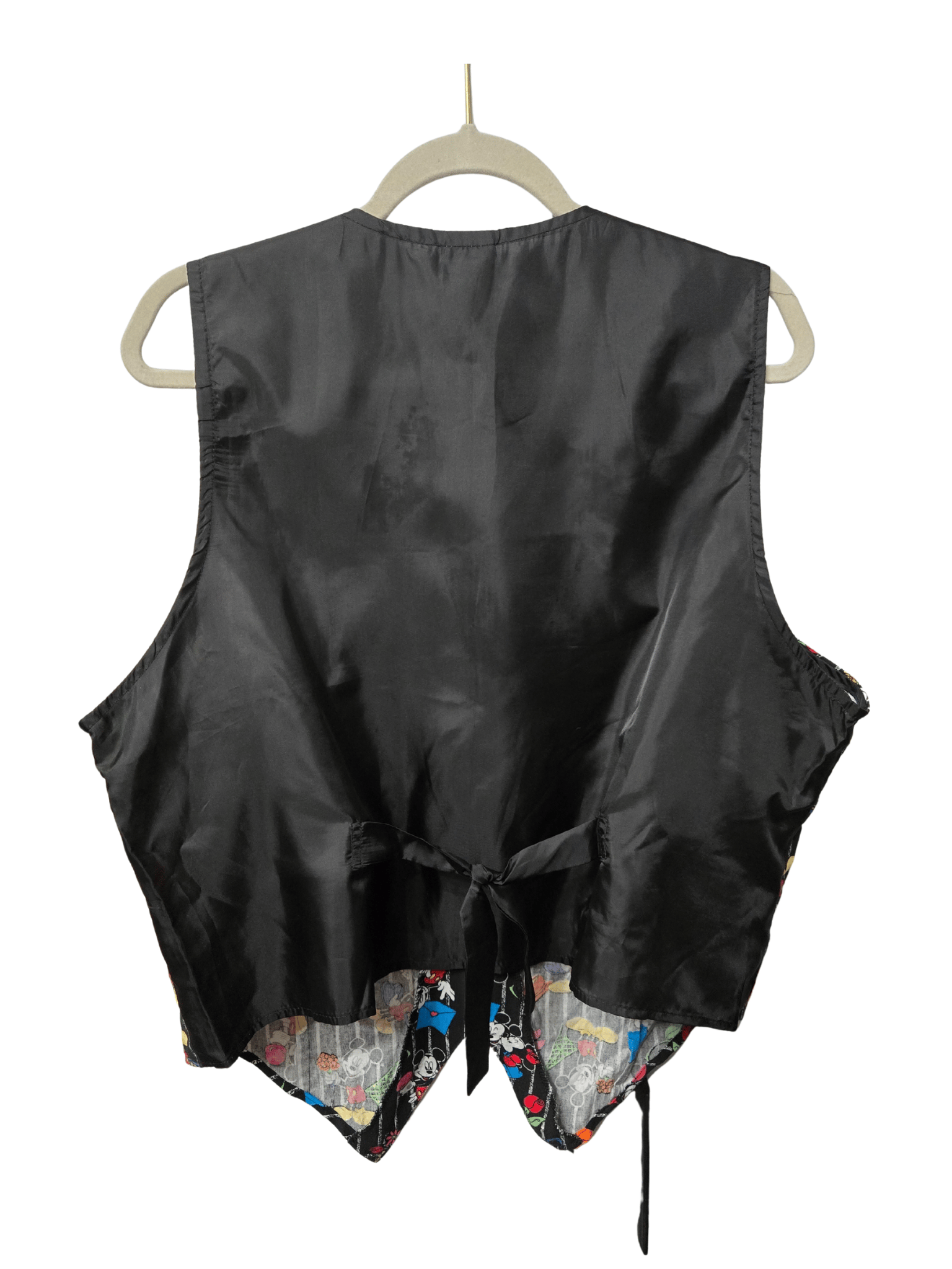 -3 buttons to secure; black with orange/pink/blue/green/yellow/white Mickey & Minnie mouse print; solid black on back; tie strap on back