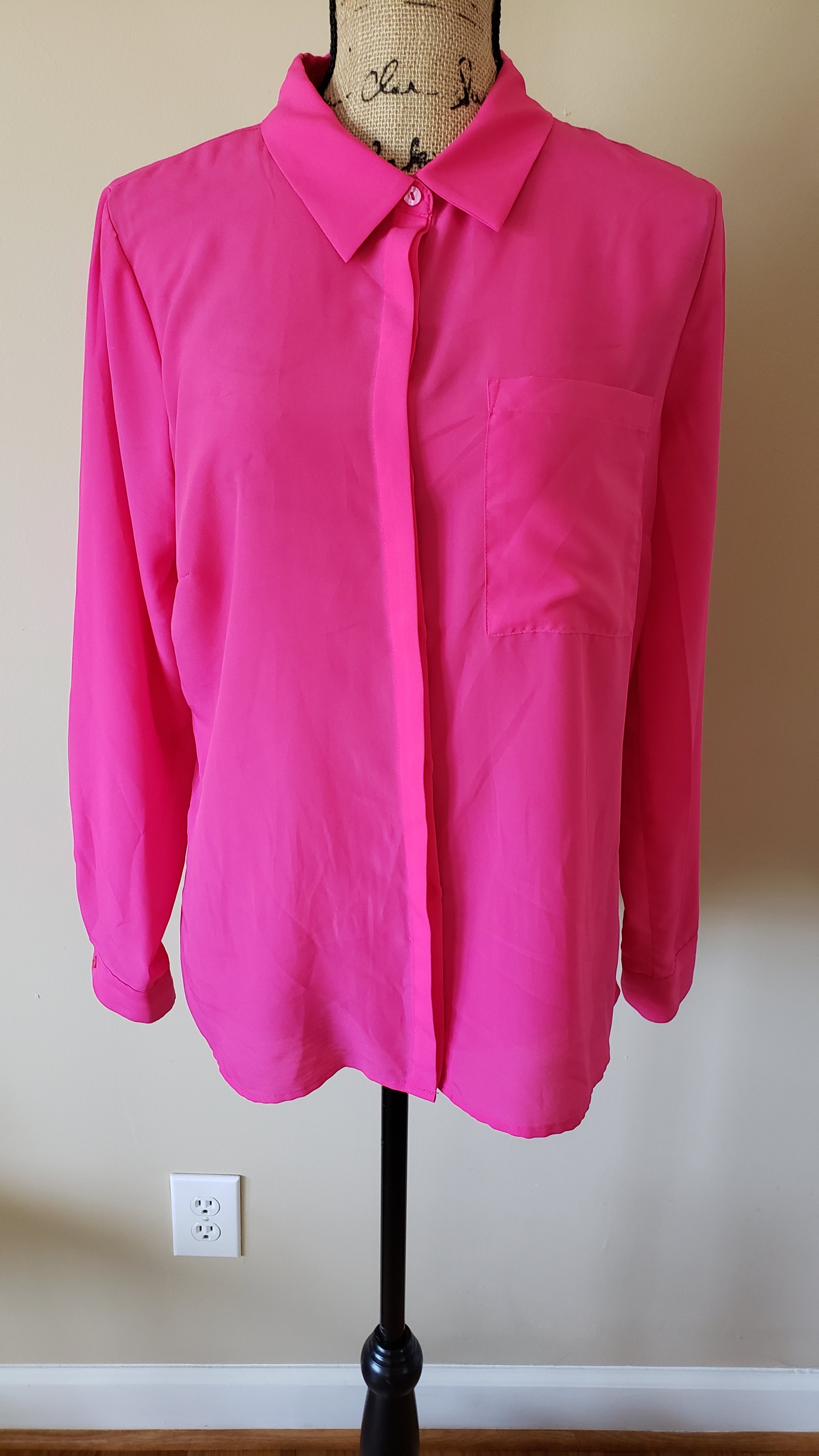 Description: Long sleeve, buttons to collar; no shoulder pads, sheer, front pocket